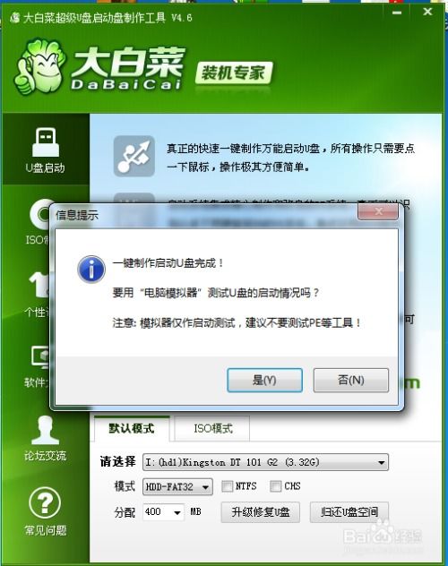 3. 制作启动盘:打开大白菜超级U盘启动制作工具,选择“制作启动盘”功能,然后按照提示操作。在制作过程中,请确保U盘不要拔出,以免损坏。